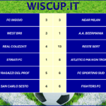 Classifica: ATLETICO MA NON TROPPO 15 (6) – FC SPORTING SUD * 15 (5) – FC INGOIO 13 (6) – RESTE SERT * 12 (5) – FIGHTERS FC 10 (6) – I RAGAZZI DEL PROF * 9 (5) – SAN CARLO SESTO * 9 (5) – NEAR MILAN 8 (6) – WEST BR8 6 (6) – STRITATI FC 3 (6) – A.A. BEERMANIA 0 (6) – REAL COLIZZATI 0 (6)