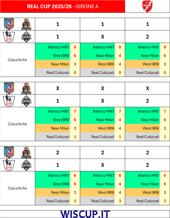 Come detto, Atletico Ma Non Troppo è certo del primo posto, in quanto anche se dovesse perdere con Real Colizzati, ha dalla sua entrambi gli scontri diretti sia con Giamma che Matteo. Quindi, proprio Near Milan e West BR8 si giocano il pass nel “tu per tu”: chi vince (va a 6 punti) ed è certo di passare (come seconda), chi perde ha una lievissima possibilità, restando a 3 punti. In caso di pareggio, Near finirebbe secondo per la miglior differenza reti generale (a parità di scontro diretto appunto), mentre a BR8 addirittura 4 punti potrebbero non bastare per passare come una delle miglior terze…