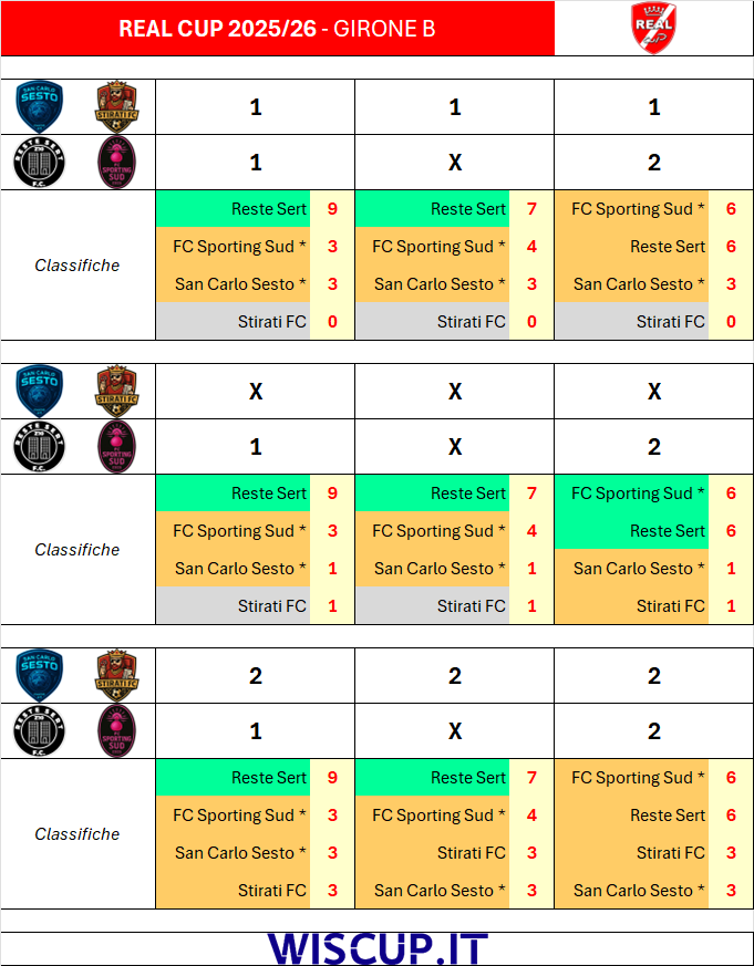 Ultima giornata della Fase a Gironi della REAL CUP 2025/26; ancora tutto aperto nei 3 raggruppamenti, solo Atletico è certo del passaggio del turno. Ma andiamo con ordine, illustrando le possibili combinazioni in ogni singolo girone, ricordando che passano ai Quarti le prime 2 di ogni gruppo (in verde), più le 2 migliori terze. Le squadre contraddistinte in arancione, dipende dalla differenza reti, che ovviamente quasi impossibile calcolare, considerando le svariate combinazioni.