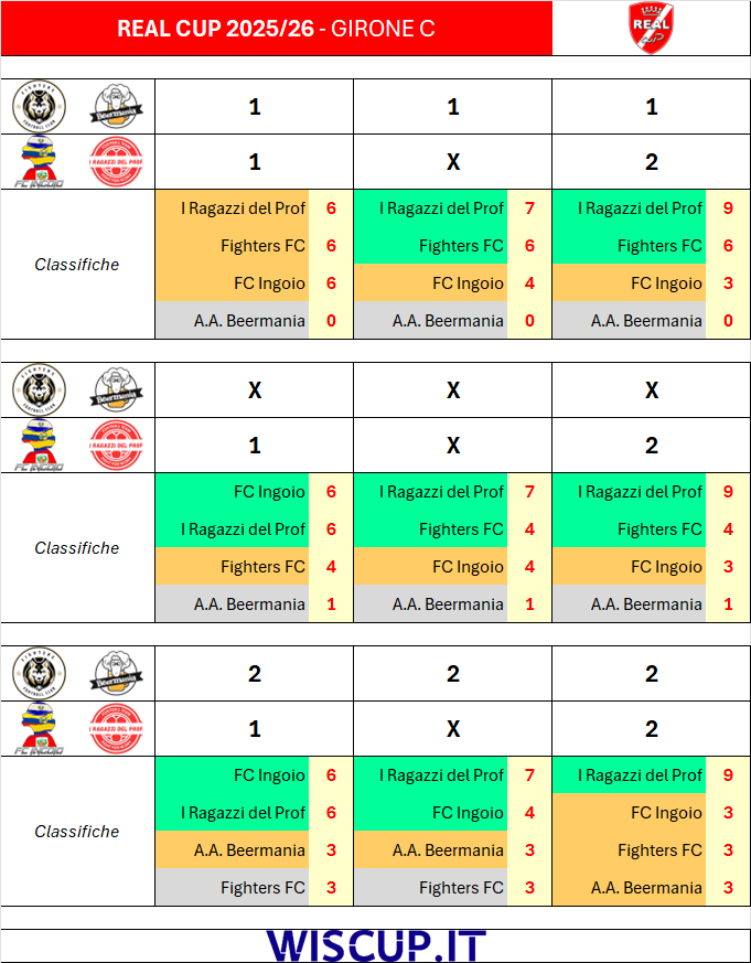 Battezzato come il “girone di ferro”! Anche qui potremmo avere un arrivo con 3 squadre a parimerito con 6 punti: FC Ingoio dovrebbe battere I Ragazzi del Prof e Fighters FC superare A.A. Beermania. A quel punto, classifica avulsa a 3 squadre che prende in esame solo i risultati delle 3 formazioni coinvolte (escludendo quindi i risultati acquisiti contro Beermania): a parità di punti ovviamente conterà la differenza reti che al momento vede Piero a +3, Kevin 0, Jordy -3. Per essere certo del passaggio del turno quindi Ingoio deve battere il “Prof” con 4 reti di scarto, ma così facendo Piero scalerebbe addirittura al terzo posto (con i “lupi” vittoriosi). Se invece I Ragazzi vince passa come primo con Fighters secondo a patto che non perda; perché se i “verdi” dovessero uscire sconfitti, avremmo una classifica avulsa a 3 con Ingoio, Fighters e Beermania… per la seconda piazza
