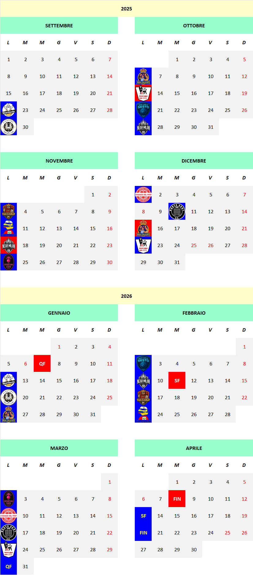 ATLETICO MA NON TROPPO 22 Ottobre 202421 Ottobre 2025 SelezionareWIS CUPREAL CUP Panoramica Partite Rosa Statistiche giocatore Nome abbreviato:ATLLuogo d'incontro:Boccaccio 22-09-2025 21:00 A.A. BEERMANIA 3 - 15 ATLETICO MA NON TROPPOBoccaccio 29-09-2025 21:00 FIGHTERS FC 2 - 4 ATLETICO MA NON TROPPOBoccaccio 06-10-2025 22:30 ATLETICO MA NON TROPPO 14 - 2 REAL COLIZZATIBoccaccio 13-10-2025 21:30 WEST BR8 4 - 7 ATLETICO MA NON TROPPOBoccaccio 20-10-2025 20:30 SAN CARLO SESTO 4 - 7 ATLETICO MA NON TROPPOBoccaccio 27-10-2025 22:30 ATLETICO MA NON TROPPO 4 - 5 NEAR MILANBoccaccio 03-11-2025 21:30 STIRATI FC 1 - 8 ATLETICO MA NON TROPPOBoccaccio 10-11-2025 21:30 FC INGOIO 2 - 5 ATLETICO MA NON TROPPOBoccaccio 17-11-2025 20:30 ATLETICO MA NON TROPPO 7 - 4 NEAR MILANBoccaccio 24-11-2025 20:30 ATLETICO MA NON TROPPO 4 - 2 FC SPORTING SUDBoccaccio 01-12-2025 21:30 I RAGAZZI DEL PROF 3 - 1 ATLETICO MA NON TROPPOBoccaccio 15-12-2025 22:30 ATLETICO MA NON TROPPO v REAL COLIZZATI 22-12-2025 20:30 WEST BR8 v ATLETICO MA NON TROPPO 07-01-2026 22:30 ATLETICO MA NON TROPPO v RESTE SERT 12-01-2026 21:30 ATLETICO MA NON TROPPO v A.A. BEERMANIA 19-01-2026 21:30 ATLETICO MA NON TROPPO v FIGHTERS FC 26-01-2026 22:30 REAL COLIZZATI v ATLETICO MA NON TROPPO 02-02-2026 20:30 ATLETICO MA NON TROPPO v SAN CARLO SESTO 09-02-2026 22:30 NEAR MILAN v ATLETICO MA NON TROPPO 16-02-2026 21:30 ATLETICO MA NON TROPPO v STIRATI FC 23-02-2026 21:30 ATLETICO MA NON TROPPO v FC INGOIO 02-03-2026 22:30 FC SPORTING SUD v ATLETICO MA NON TROPPO 09-03-2026 21:30 ATLETICO MA NON TROPPO v I RAGAZZI DEL PROF 16-03-2026 20:30 RESTE SERT v ATLETICO MA NON TROPPO 23-03-2026 20:30 ATLETICO MA NON TROPPO v WEST BR8Visualizza510202550100Tutto Amoroso Mattia Cattaneo Mirko Crusco Edoardo Gaetano Cucco Antonio Alessio Cucco Giuseppe Antonio Di Matteo Christian El Hassiny Muhamed Guzzo Gabriel Mazzoni Davide Misitano Dario Nacamulli Andrea Olar Daniela Piasentin Nicolò Pinton Giorgia Putignani Edoardo Quadrio Riccardo Sanchez Mansilla Paul Anthony Nome NR Amoroso Mattia 0 0 10 8 0 0 Cattaneo Mirko 0 0 0 1 0 0 Crusco Edoardo Gaetano 0 0 7 4 2 0 Cucco Antonio Alessio 0 0 0 9 0 4 Cucco Giuseppe Antonio 0 0 0 2 0 0 Di Matteo Christian 0 0 4 9 0 0 El Hassiny Muhamed 0 0 3 9 0 0 Guzzo Gabriel 0 0 0 6 0 0 Mazzoni Davide 0 0 2 3 0 0 Misitano Dario 0 0 0 0 0 0 Nacamulli Andrea 0 0 3 1 0 0 Olar Daniela 0 0 0 5 0 0 Piasentin Nicolò 1 0 15 9 2 0 Pinton Giorgia 0 0 0 9 0 0 Putignani Edoardo 1 0 17 9 3 0 Quadrio Riccardo 0 0 0 0 0 0 Sanchez Mansilla Paul Anthony 0 0 1 8 0 0