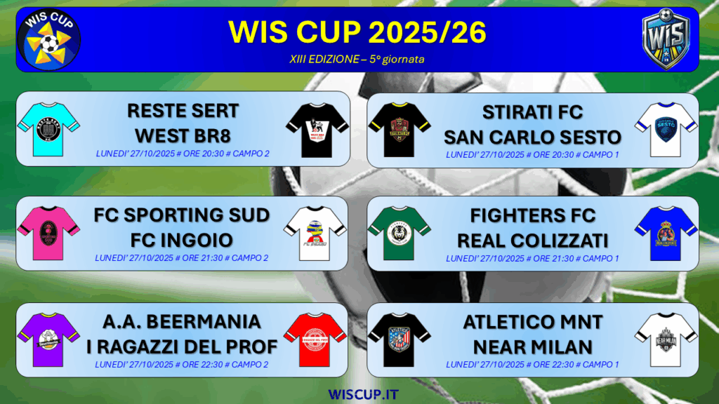 Altro crocevia interessante questa settimana, nella WIS CUP 2025/26, dove ricordiamo si giocheranno anche i recuperi della I giornata. Partiamo stasera con la V giornata e subito due big-match già fondamentali; su tutte spicca lo scontro al vertice fra FC SPORTING SUD e FC INGOIO! Entrambe le formazioni sono imbattute, con Andy che insegue, semplicemente perché ha un incontro da recuperare, quindi scontro fratricida contro Jordy, che sta volando, ma chi vince da un segnale di forza al torneo!
