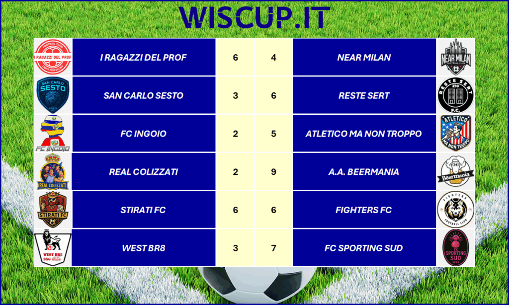 Classifica: ATLETICO MA NON TROPPO 18 (7) – FC SPORTING SUD * 18 (6) – RESTE SERT * 15 (6) – FC INGOIO 13 (7) – I RAGAZZI DEL PROF * 12 (6) – FIGHTERS FC 11 (7) – SAN CARLO SESTO * 9 (6) – NEAR MILAN 8 (7) – WEST BR8 6 (7) – STRITATI FC 4 (7) – A.A. BEERMANIA 3 (7) – REAL COLIZZATI 0 (7)